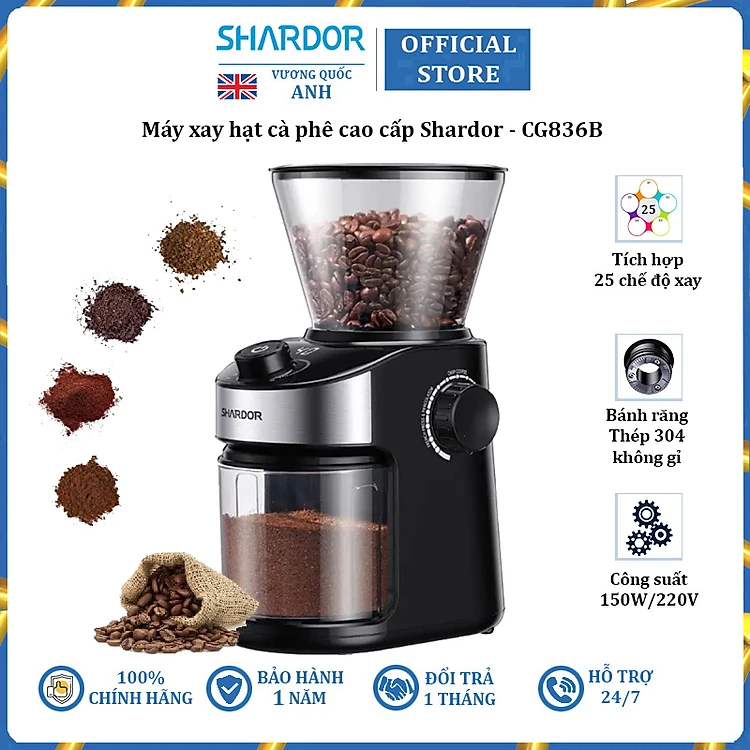 Máy xay hạt cà phê cao cấp thương hiệu Shardor CG836B công suất 150W tích hợp 25 chế độ xay - Hàng Chính Hãng