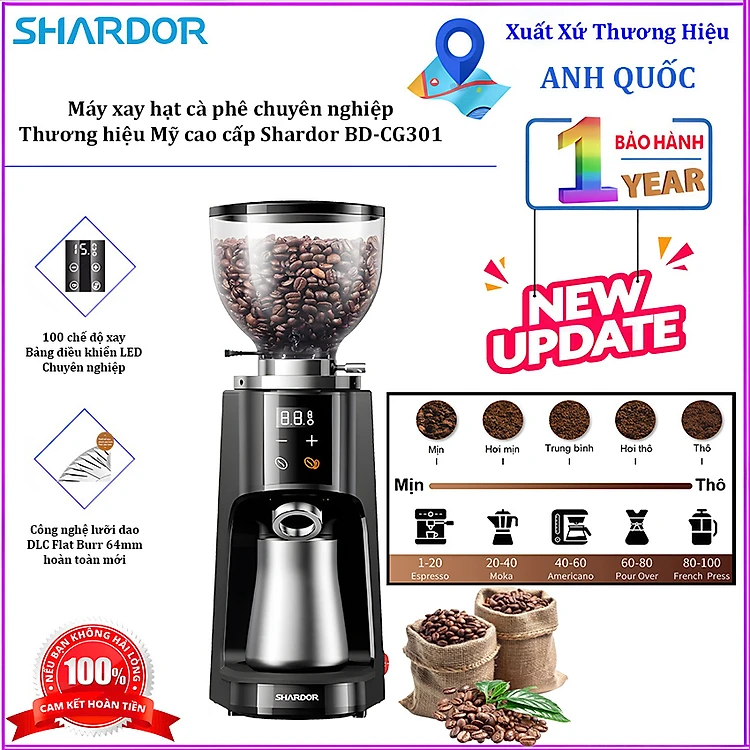 Máy xay hạt cà phê chuyên nghiệp dùng cho gia đình, quán cà phê vừa và nhỏ. Thương hiệu Mỹ cao cấp Shardor BD-CG301. HÀNG CHÍNH HÃNG
