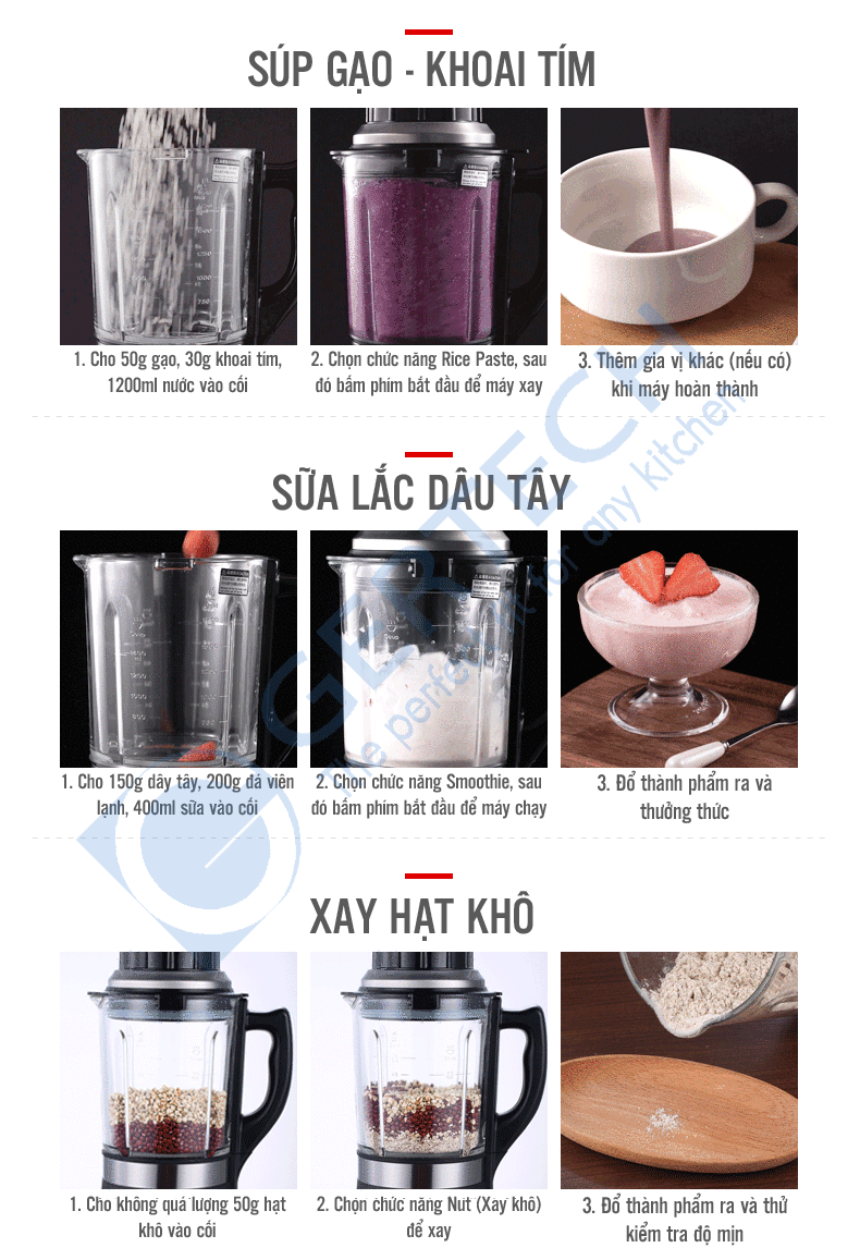 | Công dụng | Làm sữa hạt; Nấu cháo dinh dưỡng; Sinh tố rau quả; Nấu súp; Xay ngũ cốc, hạt khô; Xay xương, thịt, cá; Làm kem đá bào… |