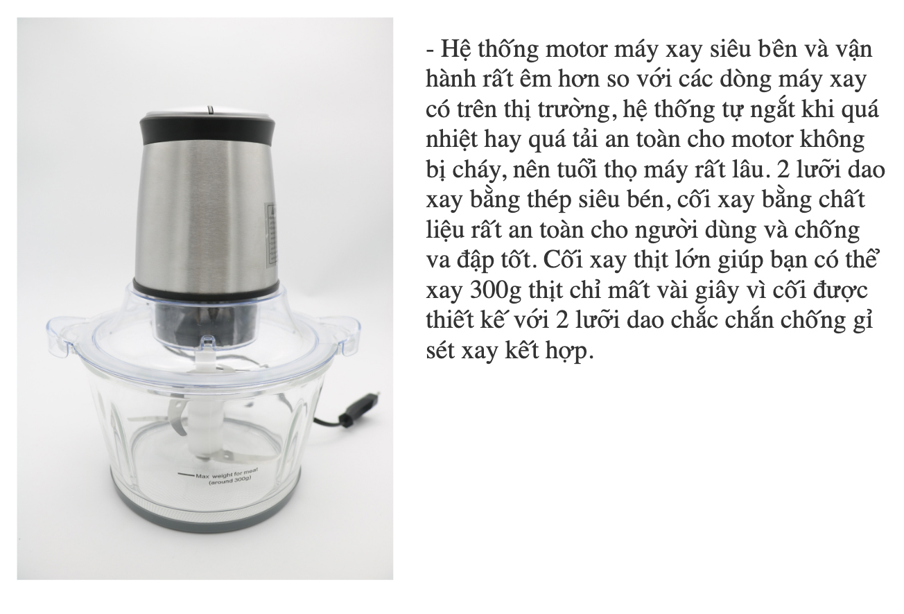 Máy có thiết kế mới, nhỏ gọn và thời trang giúp người sử dụng dễ dàng mang đi lại, vệ sinh. - Đồng thời máy được trang bị 2 lưỡi dao xay đồng thời với công suất 800W có thể xoay được các loại hoa quả và thịt, thậm chí xay được rất tốt các loại hạt và xay được cả đá. Máy còn có thiết kế đơn giản chỉ cần ấn phần nắp xuống là xay, vừa an toàn vừa tiện dụng. Bạn sẽ có một ly hoa quả xay sinh tố cùng với đá mát lành vào những ngày hè nóng bức.