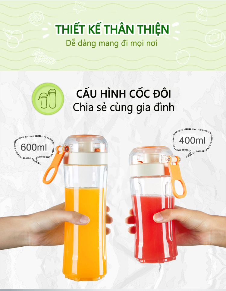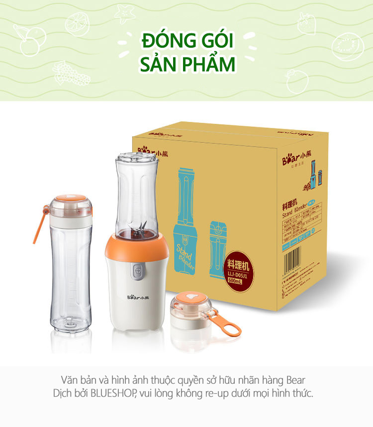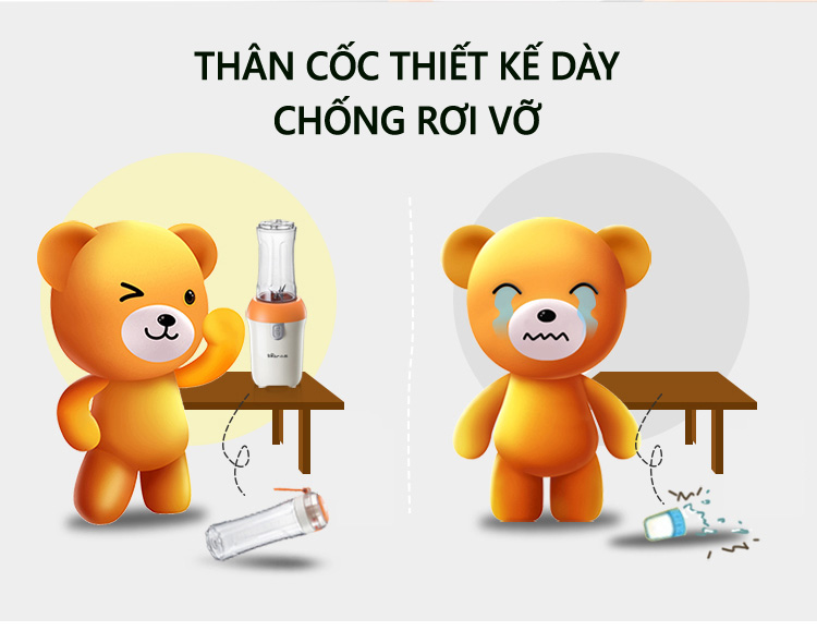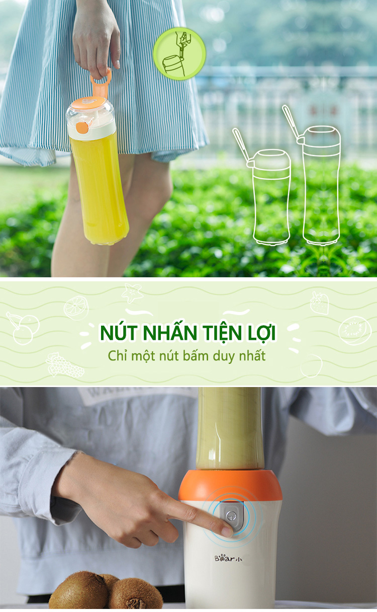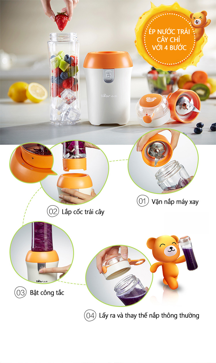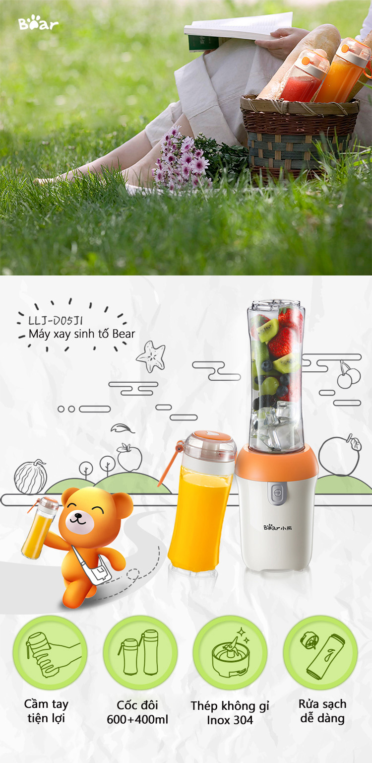 - Máy Xay Sinh Tố Đa Năng Cầm Tay Bear D05J1 được trang bị cốc xay lớn có thể sử dụng làm bình nước mang theo tiện lợi, giúp bạn dễ dàng và thuận tiện chế biến nhiều lạo thực phẩm thơm ngon, bổ dưỡng cho gia đình.