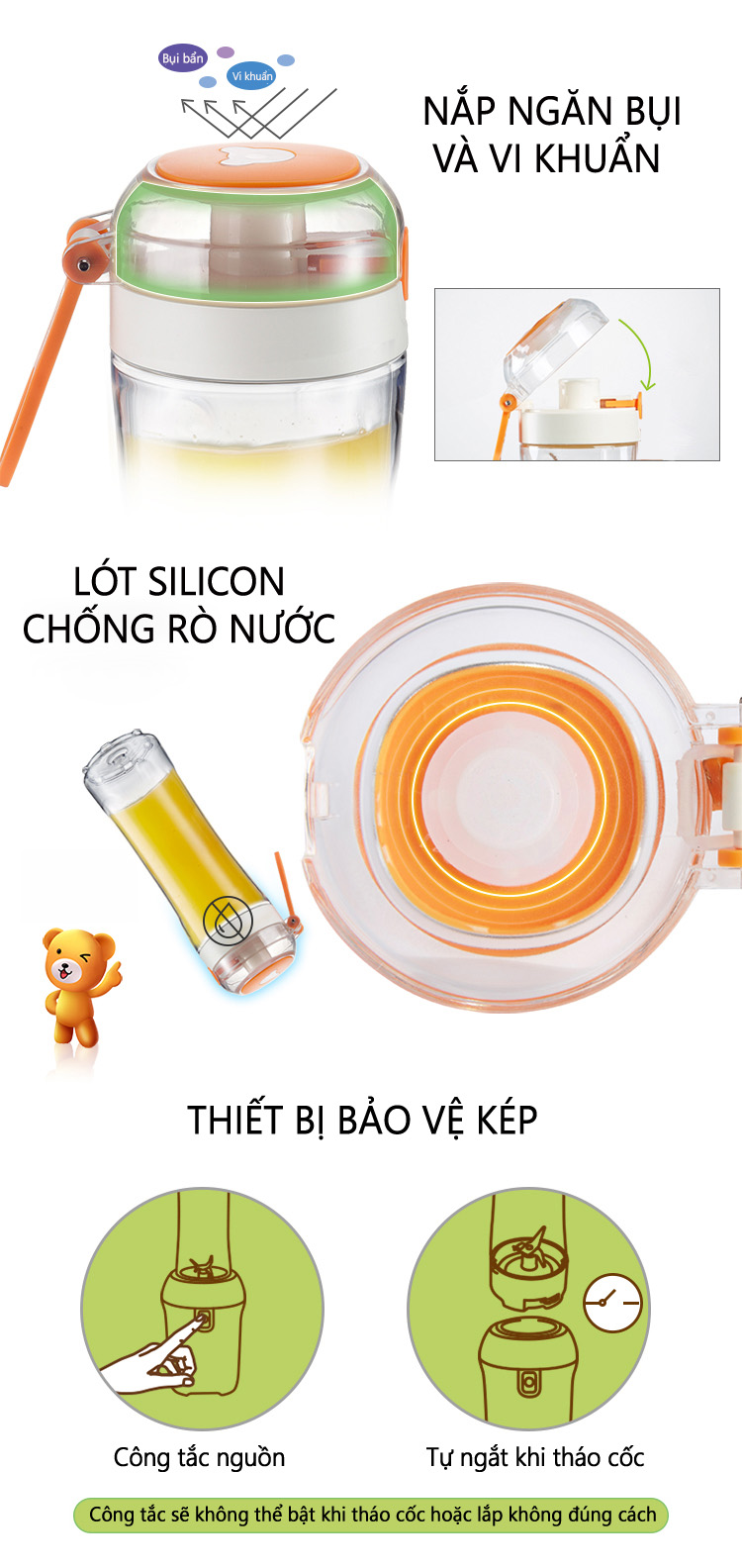 - Chất liệu nhựa không BPA kết hợp thép không gỉ cao cấp có độ bền cao, không tiết ra chất độc hại trong quá trình sử dụng, an toàn tuyệt đối cho sức khỏe người dùng.