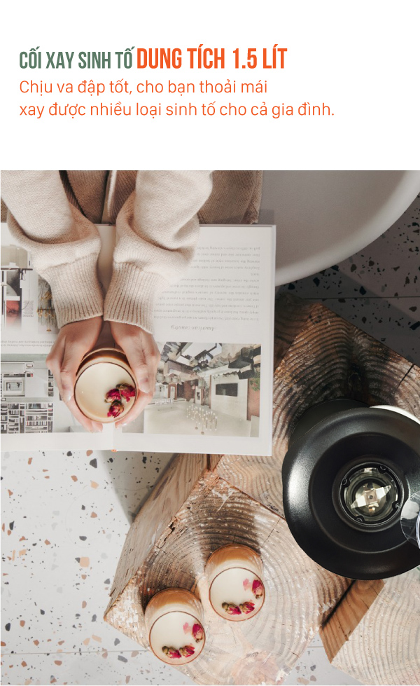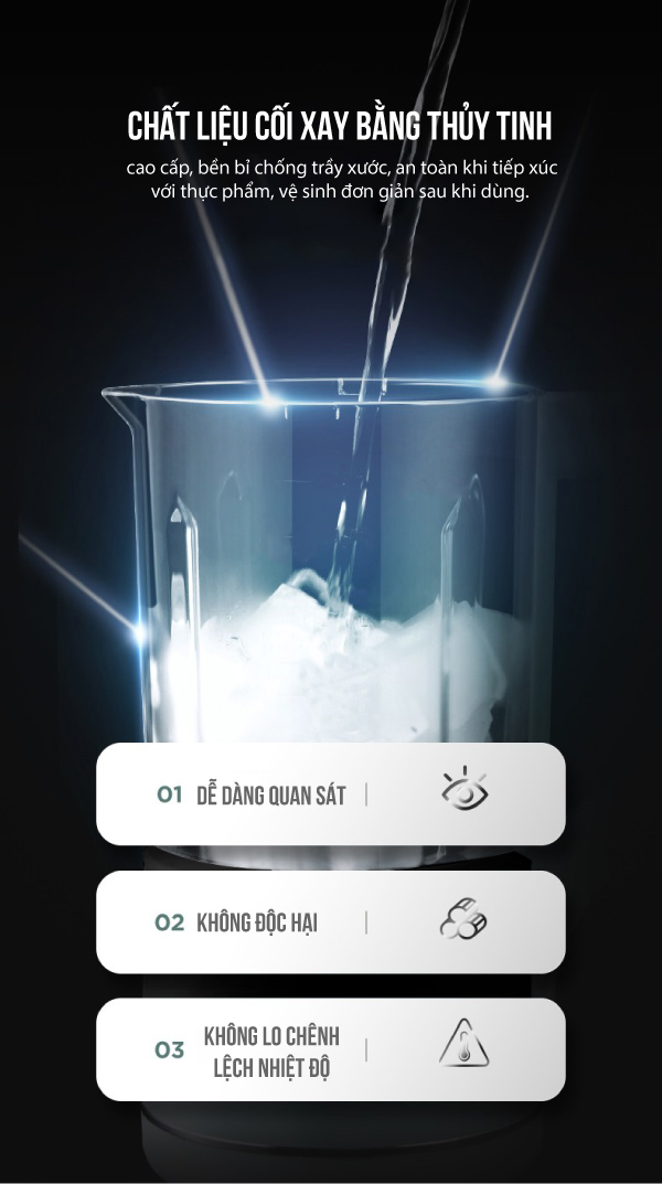 Máy trang bị cối xay sinh tố dung tích 1.5 lít, chịu va đập tốt, cho bạn thoải mái xay được nhiều loại sinh tố cho cả gia đình. Chất liệu cối xay bằng thủy tinh cao cấp, bền bỉ chống trầy xước, an toàn khi tiếp xúc với thực phẩm, vệ sinh đơn giản sau khi dùng. Ngoài ra máy còn trang bị thêm cối xay khô. Cối xay khô bằng Inox SS 304 có thể dùng để xay hạt như tiêu, lạc, vừng, ngũ cốc