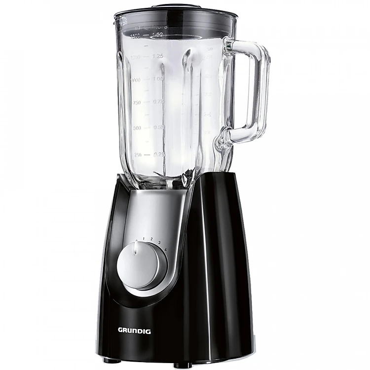 Máy Xay Sinh Tố GRUNDIG SM7280C Thân máy màu đen bóng sang trọng, núm xoay và các chi tiết được ốp inox. Thiết kế khởi động xay bằng nút xoay trên motor. Cối xay bằng thủy tinh trong suốt có mức đo dễ dàng cho việc nhìn thấy sản phẩm trong quá trình xay.