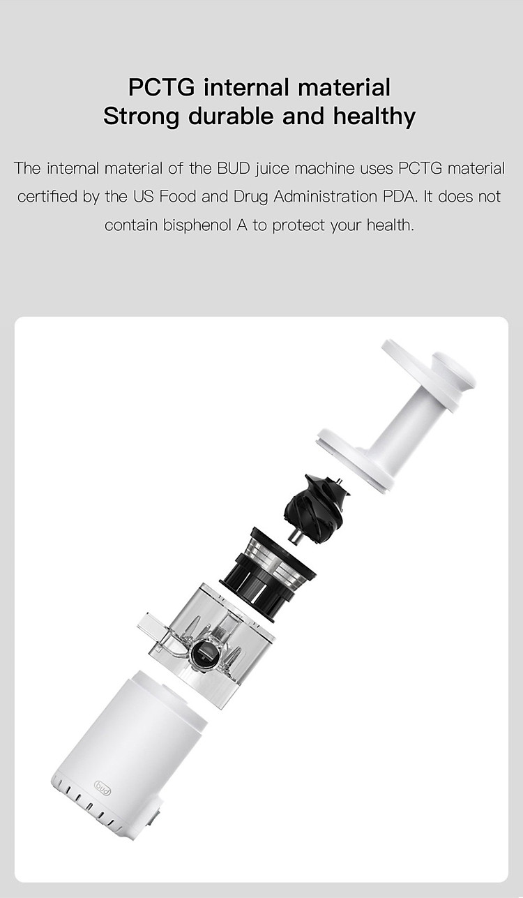 The internal material of the BUD juice machine uses PCTG material certified by the US Food and Drug Administration PDA. It does not contain bisphenol A to protect your health.