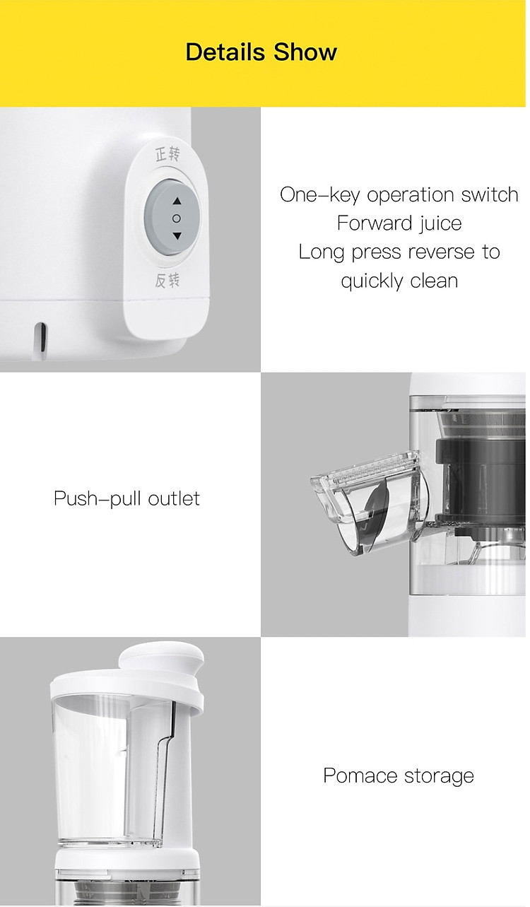 One-key operation switch Forward juice Long press reverse to quickly clean Push-pull outlet Pomace storage