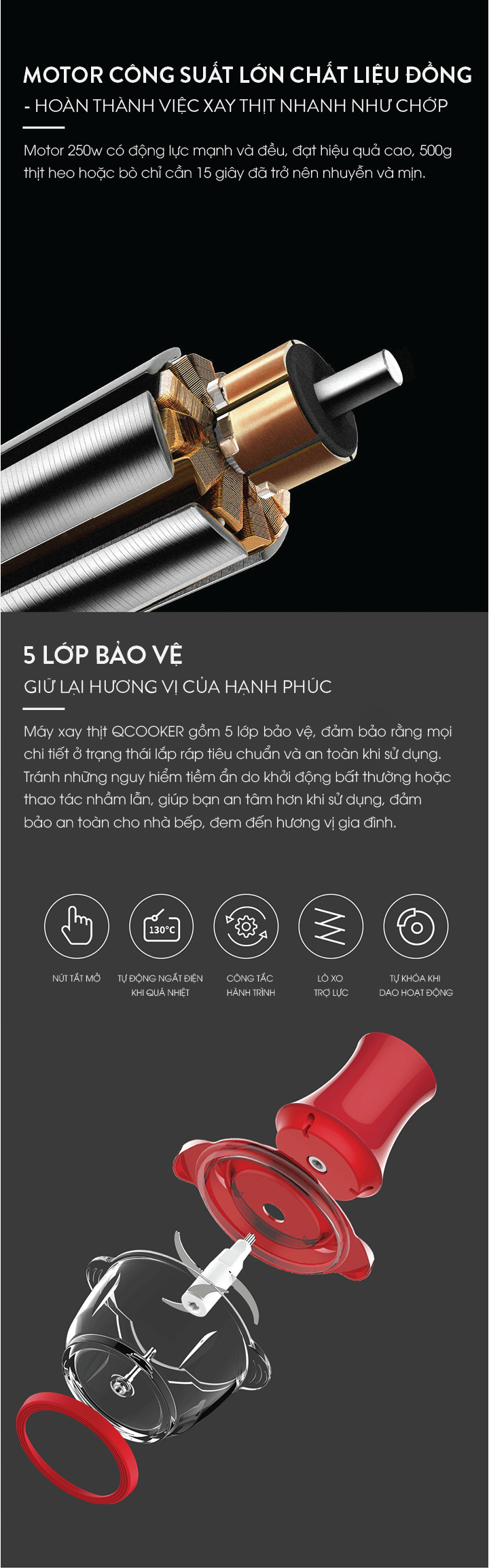 Động cơ bằng đồng thuần chất, tăng nhanh tốc độ xay thịt, có thể xay nhuyễn 500gr thịt chỉ trong 15s ngắn ngủi.