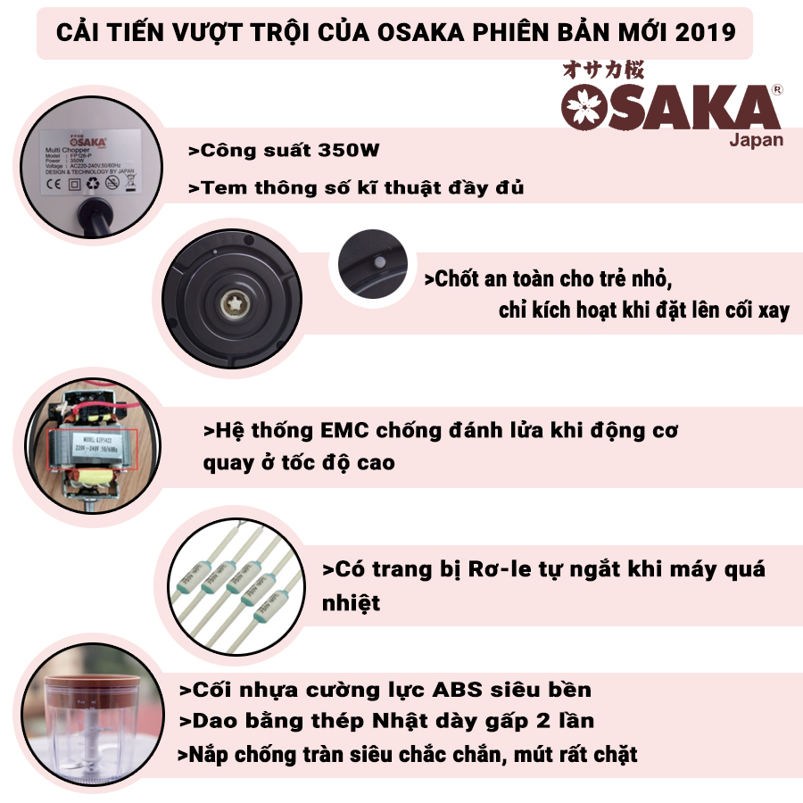 Máy xay thịt Osaka phiên bản 2019 được trang bị thêm hệ thống EMC chống đánh lửa, Rơ le tự ngắt khi quá nhiệt và chốt an toàn cho trẻ nhỏ, đảm bảo an toàn tuyệt đối trong quá trình sử dụng. Máy xay hoạt động bằng điện, phần dây gắn với thân máy, bạn chỉ cần cắm điện, nhấn nút được tích hợp ở phần thân máy là có thể khởi động máy, vô cùng linh hoạt và thuận tiện điều chỉnh. Thêm vào đó, máy được cấu tạo từ 4 phần độc lập lắp ghép với nhau có thể tháo dời, chính sự thông minh trong thiết kế này đã giúp ta dễ dàng vệ sinh sạch sẽ và lấy hết thực phẩm sau khi xay xong.