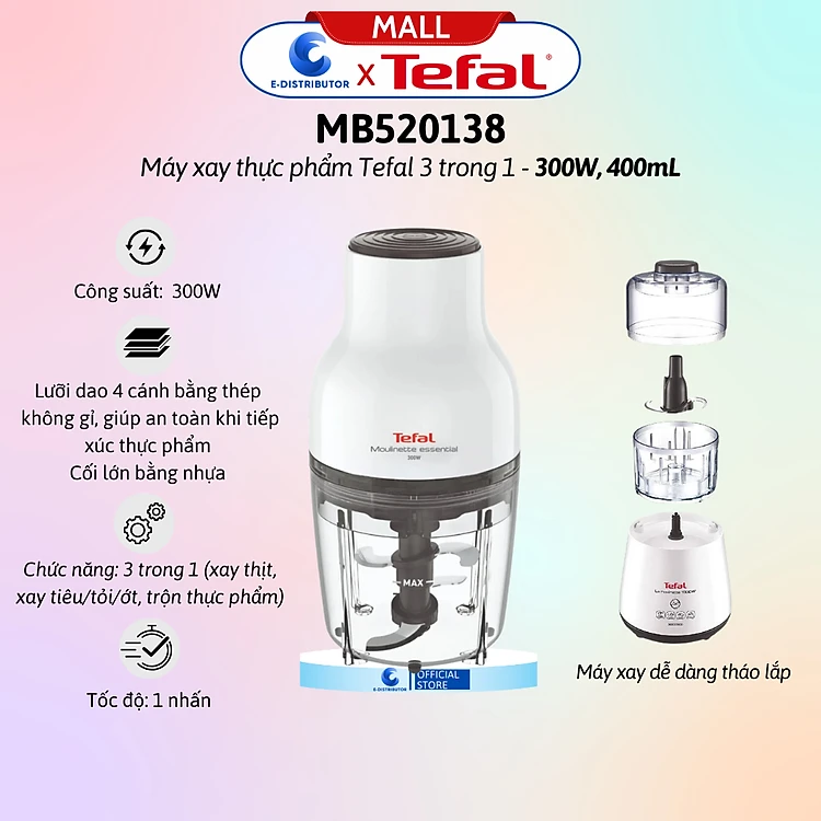 Máy xay thực phẩm Tefal 3 trong 1 MB520138 - 300W, 400mL - Hàng Chính Hãng - Bảo Hành 12 Tháng