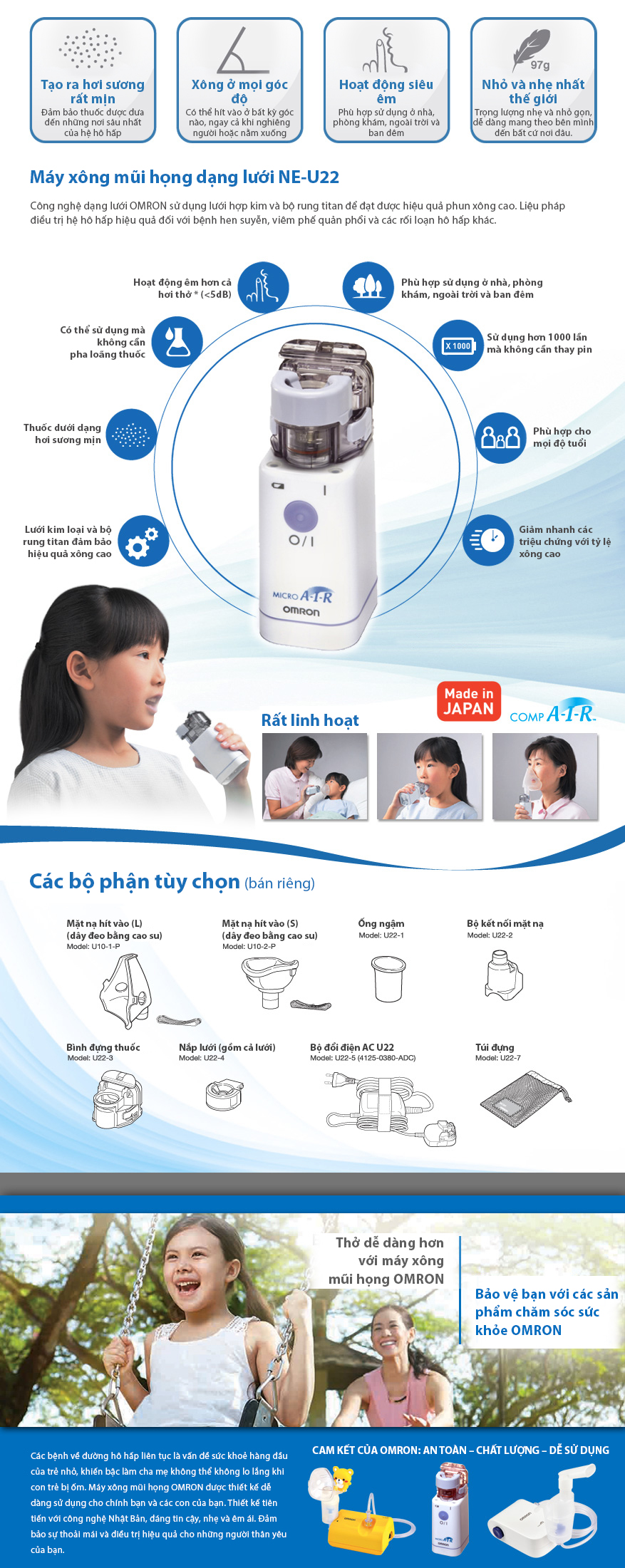 Máy xông mũi họng Omron NE-U22 ứng dụng công nghệ lưới cho hiệu qua xông hơi cao, là máy xông nhẹ nhất thế giới. Máy xông có thể sử dụng ở bắt kỳ đâu, phù hợp cho mọi lứa tuổi. Công nghệ lưới cho hiệu quả xông cao. Máy xông nhỏ và nhẹ nhất thế giới Phù hợp với mọi lứa tuổi Xông ở bất kỳ độ nghiêng nào. Hoạt động êm, có thể xông ở mọi nơi. Có thể dùng pin hoặc bộ đổi điện AC.