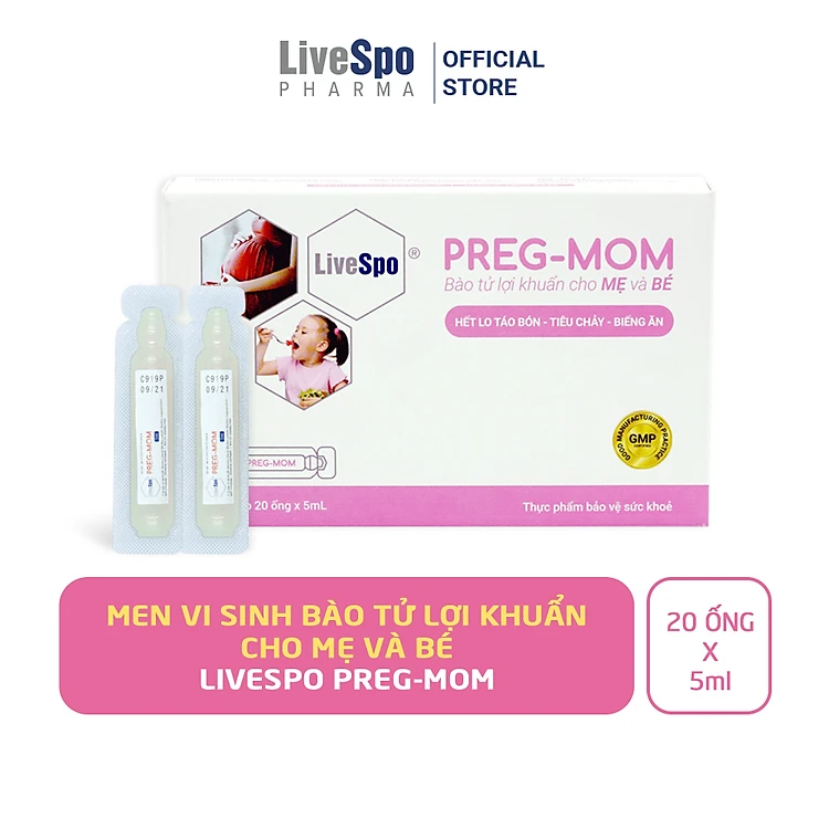 LiveSpo Pregmom - Men vi sinh 60 tỷ bào tử lợi khuẩn là sản phẩm giúp giúp cân bằng hệ vi sinh đường ruột, hỗ trợ kích thích tiêu hóa và xử lý tiêu chảy, táo bón, kém ăn, chậm lớ Với hơn 3 tỷ bào tử lợi khuẩn cùng nước cất vừa đủ, sản phẩm là sự lựa chọn hàng đầu của mẹ thông thái.