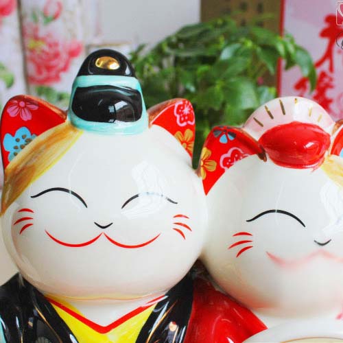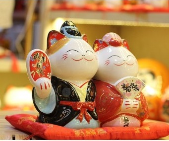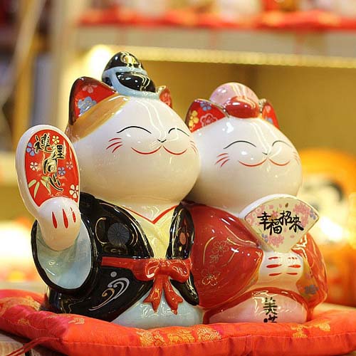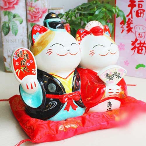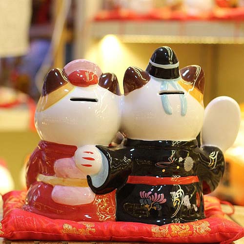 - Cặp mèo thần tài tổ chức đám cưới mặc trang phục truyền thống của Nhật –kimono: mèo chú rể mặc màu đen thắt đai đỏ sang trọng, mèo cô dâu mặc áo màu đỏ rực rỡ.