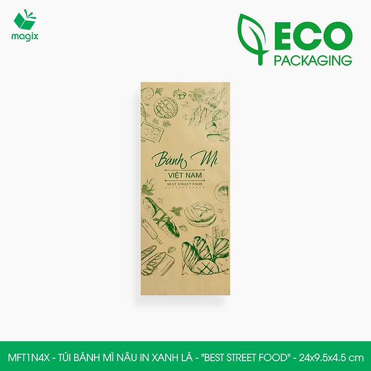 MFT1N4X - 24x9.5x4.5 cm - 200 Túi bánh mì Nâu, in sẵn họa tiết BEST STREET FOOD - Bao bánh mì Túi giấy thực phẩm an toàn