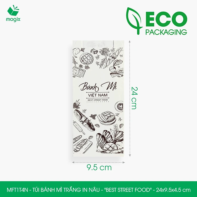 MFT1T4N - 24x9.5x4.5 cm - 100 Túi bánh mì Trắng, in sẵn họa tiết BEST STREET FOOD - Bao bánh mì Túi giấy thực phẩm an toàn