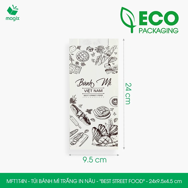 MFT1T4N - 24x9.5x4.5 cm - 200 Túi bánh mì Trắng, in sẵn họa tiết BEST STREET FOOD - Bao bánh mì Túi giấy thực phẩm an toàn