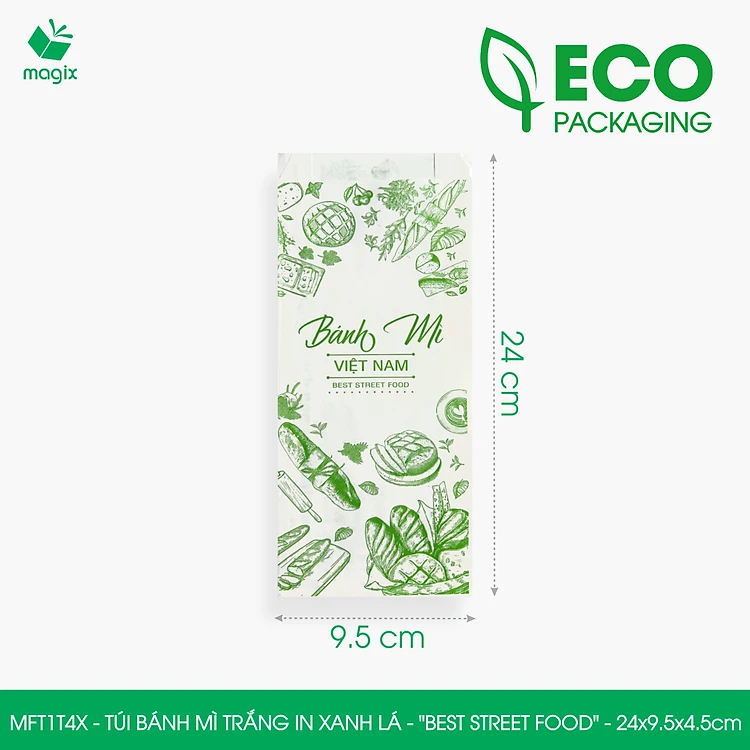 MFT1T4X - 24x9.5x4.5 cm - 200 Túi bánh mì Trắng, in sẵn họa tiết BEST STREET FOOD - Bao bánh mì Túi giấy thực phẩm an toàn