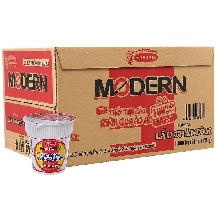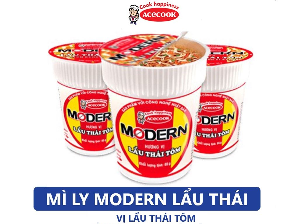 Sợi mì vàng dai ngon hòa quyện trong nước súp Vifon vị lẩu Thái tôm đậm đà thấm đều trong từng sợi cùng hương thơm lừng quyến rũ ngất ngây. 24 ly mì Modern lẩu Thái tôm 65g tiện lợi thơm ngon là lựa ngọn hấp dẫn cho những bữa ăn nhanh gọn, đơn giản và đầy đủ dưỡng chất