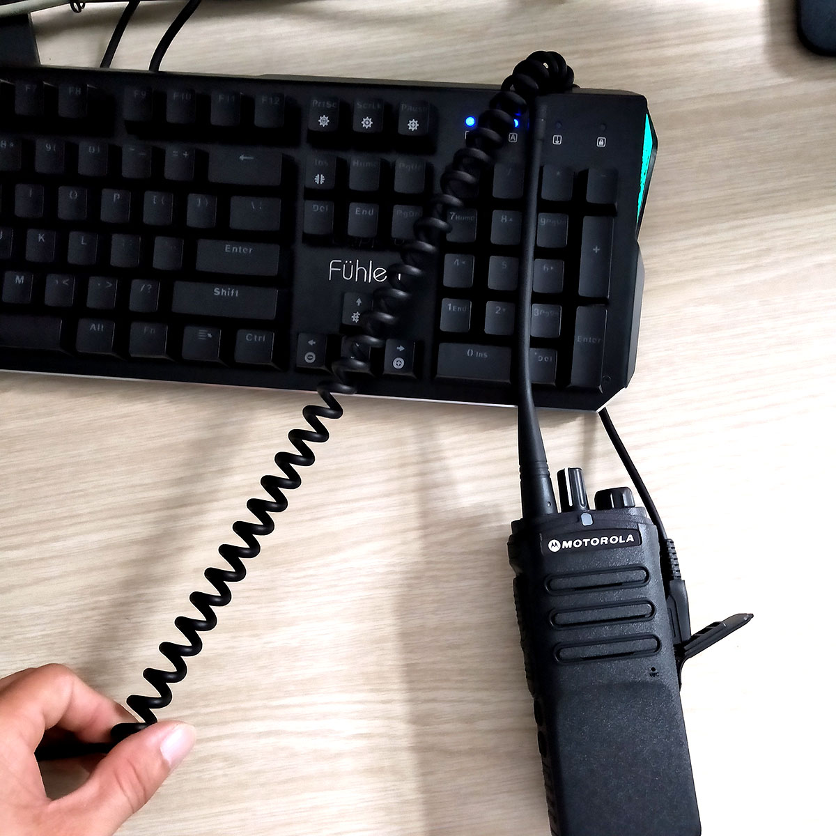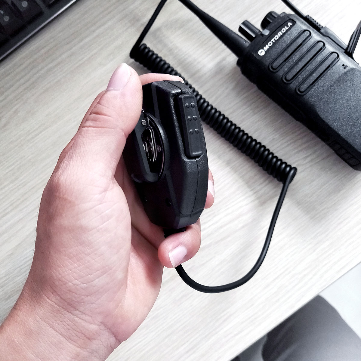 Mặc định khi sử dụng bộ đàm, chúng ta sẽ cầm bộ đàm lên gần miệng và bấm rồi nói, khi nói xong ta bỏ xuống nhưng tay vẫn cầm bộ đàm, hoặc cài bên hông. Thao tác lặp lại như vậy nhiều khi cũng làm mất thêm thời gian chút xíu và hơi cồng kềnh.