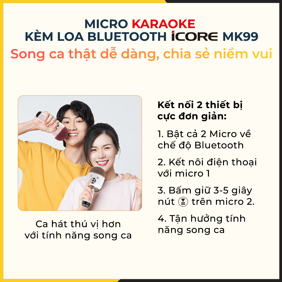 Với công nghệ kết nôi 2 micro iCore MK99 với nhau, những bản song ca sẽ không thể làm khó bạn được nữa! Khi cả 2 thiết bị cùng phát âm thanh sẽ cho ra cảm giác cộng hưởng từ nhiều hướng, giúp việc ca hát trong bàn tiệc hay buổi cắm trại cùng gia đình và bạn bè trở nên thú vị và sống động hơn rất nhiều.