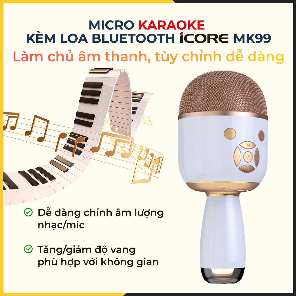 Micro karaoke kèm loa Bluetooth iCore MK99 cho khả năng chỉnh âm lượng nhạc để phù hợp với không gian và giọng hát của bạn. Bạn cũng có thể thoải mái chỉnh âm lược của mic cũng như độ vang echo theo ý thích.