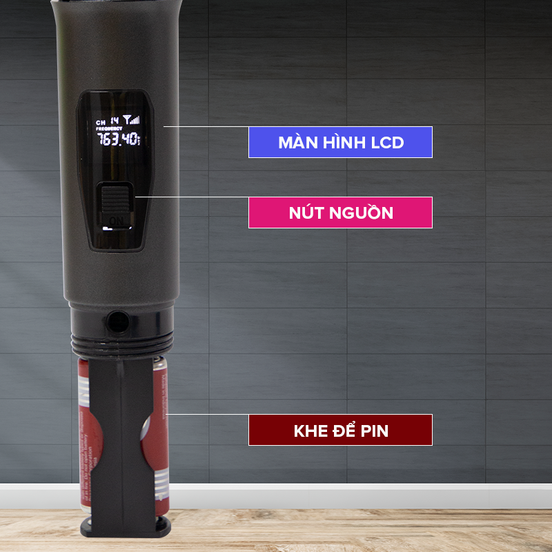 Tay mic có màn hình LED màu trắng để hiển thị tần số cùng với mức tín hiệu.