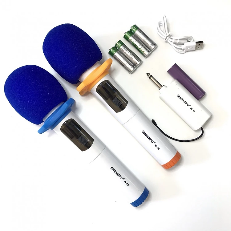 Bộ nhận sóng của micro không dây shengfu w10 cắm vào cổng 6.5mm trên loa kéo và có pin tích hợp bên trong ( có thể sạc và tích điện thông qua cổng usb trên loa kéo hay qua cục sạc dự phòng ) nên rất tiện lợi cho việc di chuyển Sử dụng 1 bộ thu dành cho cả 2 micro cùng lúc.