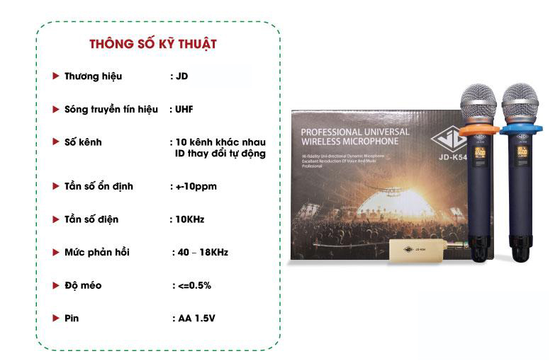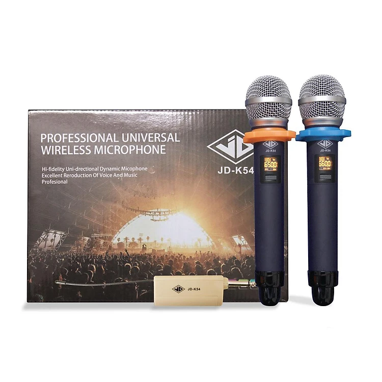Mic không dây JD K54 sử dụng sóng UHF, một trong những sóng được áp dụng rộng dãi cho công nghệ không dây bởi dải tần số rộng . Hai tay micro là hai tần số sóng khác nhau, có thể được cài đặt tự động trực tiếp trên bản thân mic .Màn hình hiển thị trên micro JD K54 được thiết kế rõ nét, hiển thị đầy đủ thông tin cần thiết như vạch sóng, pin tiêu thụ và tần số sóng giúp người sử dụng kiểm tra bằng trực giác được thời lượng sử dụng micro không dây cũng như độ ổn định của sản phẩm ở những môi trường khác nhau. Chất liệu bề bặt sử dụng cho JD K54 cho chính là lớp sơn nhám nano tĩnh điện, hạn chế tuyệt đối bong tróc, trầy xước sau một thời gian dài sử dụng sản phẩm.
