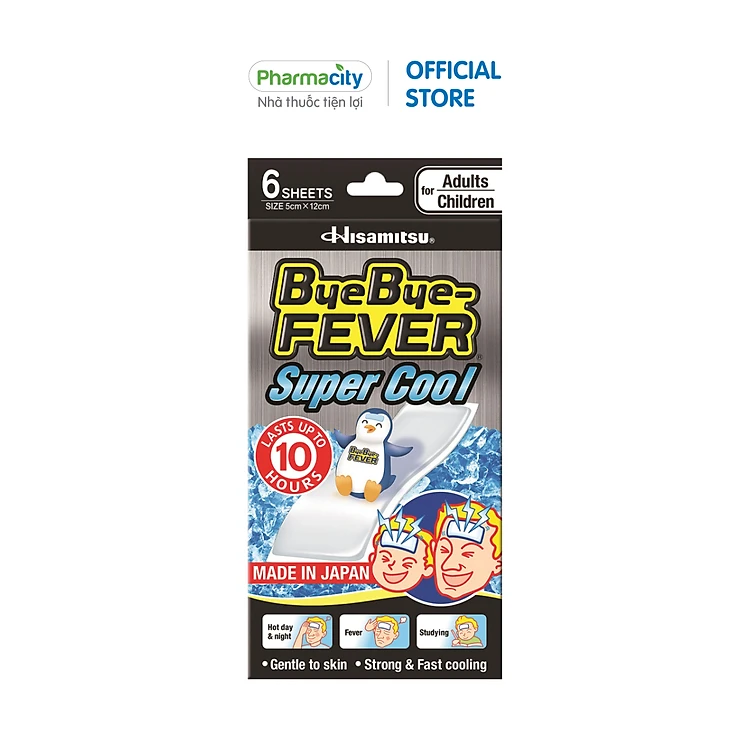 Miếng dán Bye Bye - Fever Super Cool có tác dụng hạ sốt và làm mát nhanh trong các trường hợp lái xe đường dài, làm việc, sau khi chơi thể thao, trời oi bức hoặc khi bị bầm tím. Hiệu quả kéo dài đến 10 giờ, miếng dán còn có độ bám dính tốt và hoàn toàn dịu nhẹ cho da.