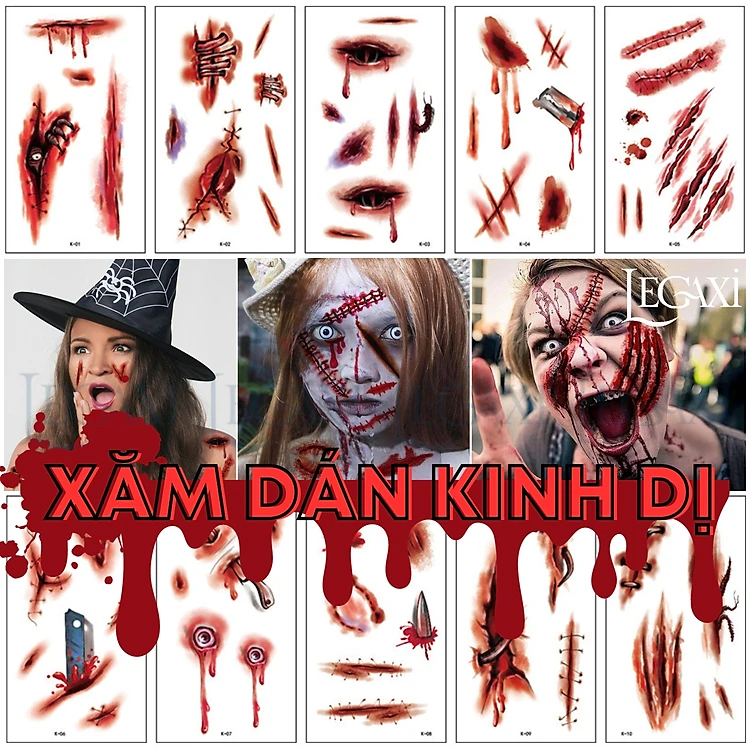 Miếng dán hình xăm kinh dị hóa trang Halloween vết sẹo xước máu giả vết khâu chảy máu vết thương Legaxi