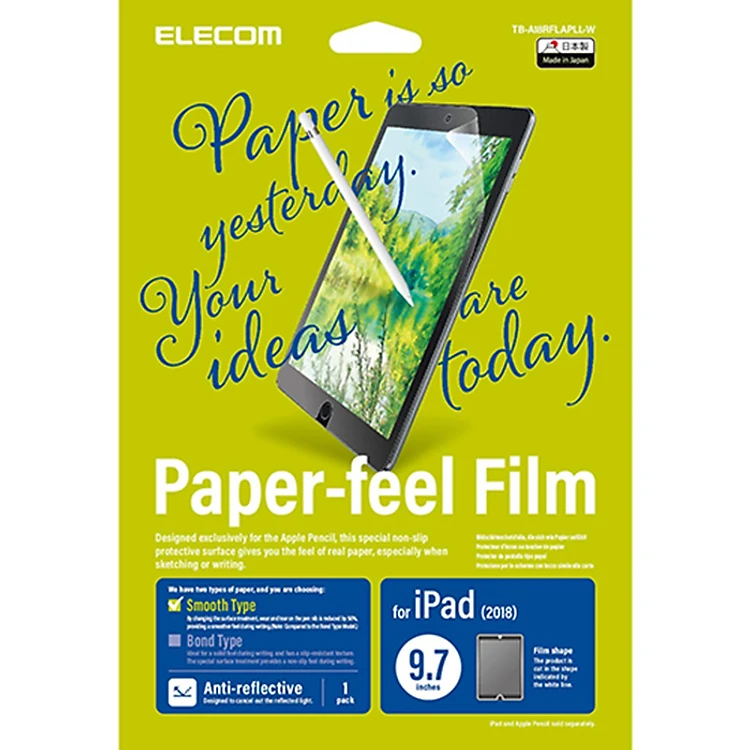 Miếng dán bảo vệ màn hình 9.7 inches Elecom Paper- Feel TB-A18RFLAPLL-W được sản xuất 100% tại Nhật Bản là miếng dán trơn bảo vệ màn hình tuyệt vời dành cho Ipad 9.7 inches chống trầy xướt, chống lóa, chống vân tay và chống hiện tượng bong bóng. Sản phẩm khiến việc vẽ bằng Apple Pencil có cảm giác như phác họa trên một tờ giấy.