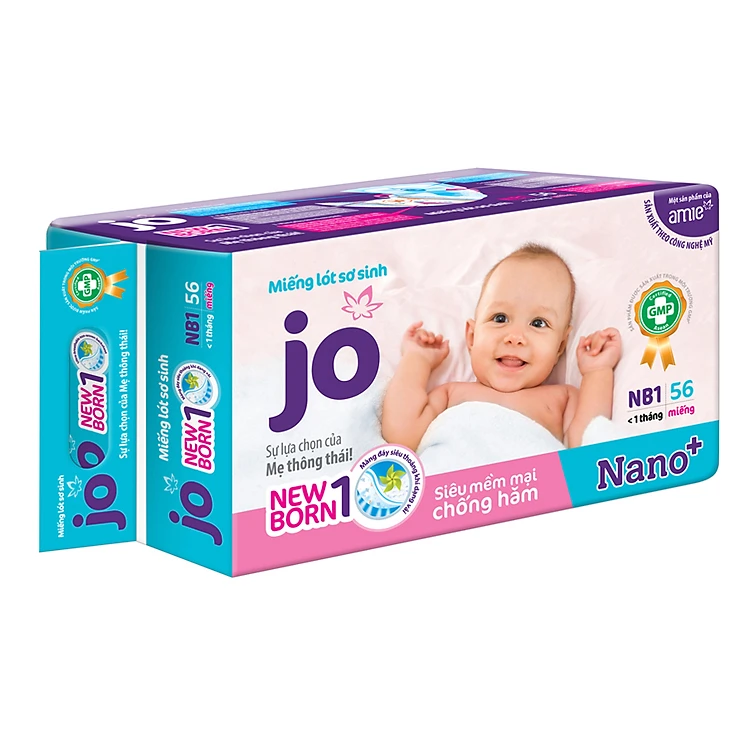- Miếng lót JO Newborn1 (56 Miếng) được thiết kế dành riêng cho trẻ sơ sinh với độ thấm hút tốt và nhanh, cùng với mặt đáy thoáng khí sẽ đem đến cho bé cảm giác thoải mái, khô ráo, tránh được hăm tã và các viêm nhiễm khác về da. Gói gồm 56 miếng được làm hoàn toàn bằng chất liệu bông siêu thấm là một lựa chọn thích hợp cho bé trong giai đoạn dưới 1 tháng tuổi.