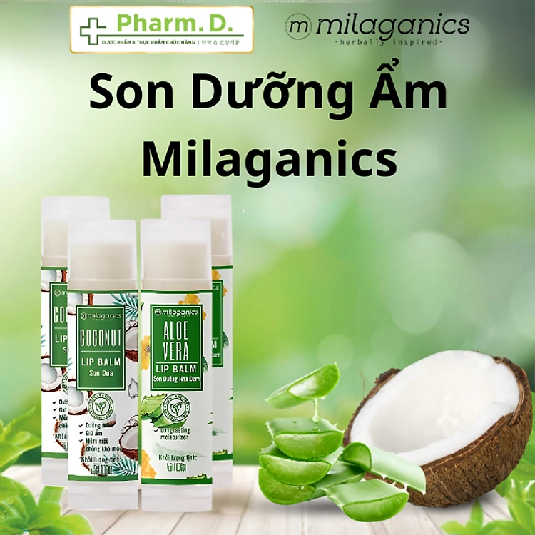 Milaganics [CHÍNH HÃNG] Combo 2 Cây Son Dưỡng Ẩm Nha Đam & Dừa 4.5g - Son Dưỡng Môi An Toàn Không Chì Dưỡng Ẩm Tối Ưu Cho Môi Nhạy Cảm