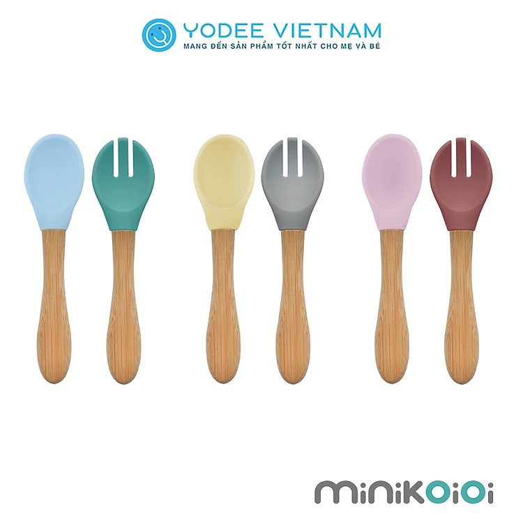 MinikOiOi Bộ muỗng nĩa silicone tay cầm bằng gỗ tre cho bé