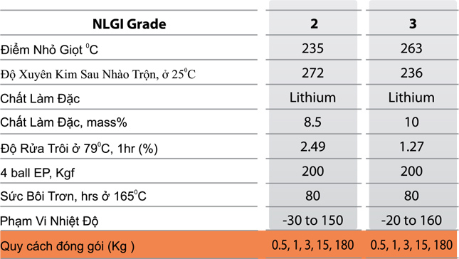 Mỡ dùng trong ô tô và công nghiệp, có kết cấu mịn, dạng bơ màu vàng nhạt với chất kết dính được sản xuất từ xà phòng lithium và chất ức chế quá trình ô xi hóa.