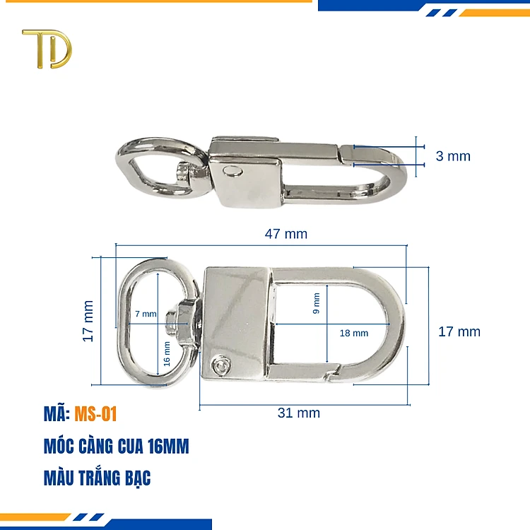 Móc càng cua túi xách,móc khóa càng cua túi xách,móc chó túi xách 16mm Mạ điện bền 5-8 năm