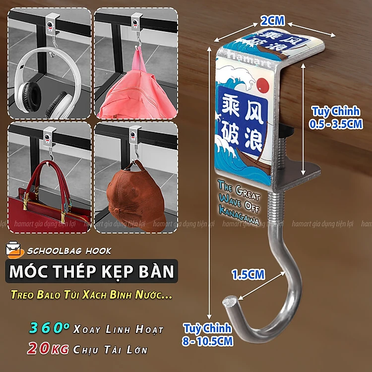 Móc Treo Balo Kẹp Cạnh Bàn Làm Việc Hamart Xoay 360 Treo Cặp Túi Xách Bình Nước Thép Xoắn Ốc Cố Định