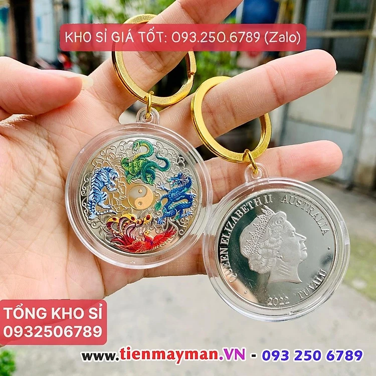 Móc treo balo túi xách Đồng Tiền Xu Phong Thuỷ Tứ Linh Long Lân Quy Phụng May Mắn, kèm Túi Gấm Đỏ, Tiền lì xì tết 2023 , NELI