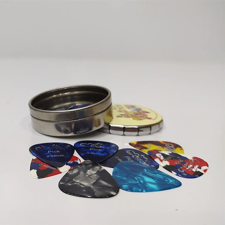 ALICE A011B - gồm 20 móng gảy nhiều màu sắc được đựng trong hộp kim loại hình tròn, chỉ cần ấn xuống là mở được rất tiện lợi.