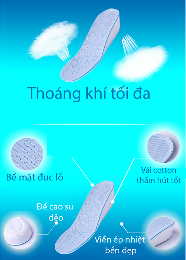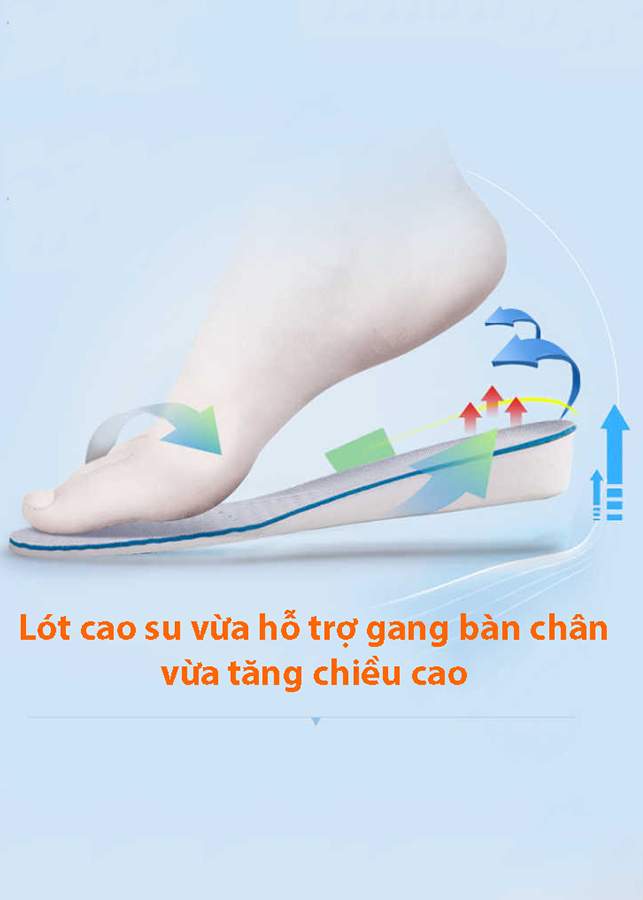 • Công dụng: lót giày cao su độn đế tăng 2.5cm hoặc 3.5cm chiều cao được dùng thay thế cho lót giày sẵn có của giày tây công sở, giày boot, giày thể thao, giày slip on, giày lười, giày mọ Lót giày giúp tăng chiều cao, khử mùi hôi chân nhờ bọt Hi-Poly và mang đến cảm giác êm chân vì có khả năng nâng đỡ gang bàn chân rất tốt.