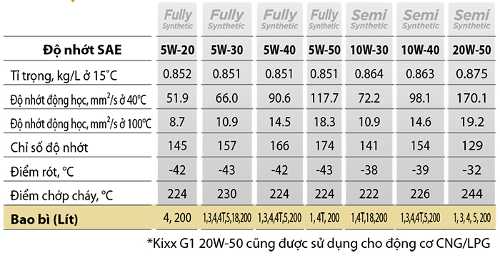 Kixx G1 được chế tạo từ dầu gốc VHVI, các hệ thống phụ gia hiệu suất cao và phụ gia tăng chỉ số độ nhớt hàng đầu đáp ứng được yêu cầu của cấp dầu động cơ tiên tiến cao cấp API SN PLUS. Sản phẩm được tối ưu hóa để cung cấp hiệu suất dầu động cơ hoàn hảo, đặc biệt là hiệu suất nhiên liệu, thông qua giảm ma sát và tăng độ bền. Ngoài ra, nó cũng giảm thiểu hư hại đột ngột tại các thành phần động cơ chính (như vòng pit tông, thanh kết nối, ) bằng cách ngăn chặn hiện tượng LSPI (Đánh lửa Trước Ở Tốc độ Thấp) trong các động cơ T-GDI.
