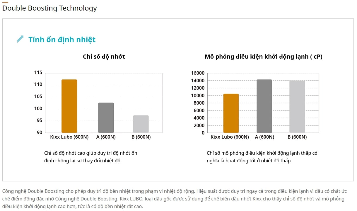 Để có được hiệu suất thích hợp nhất của dầu máy Kixx đã sử dụng kỹ thuật Double Boosting để tăng tính ổn định của chuyển động, và kỹ thuật Triple Anti để giảm sự tiêu hao động lực do ma sát, ô xy hoá và mài mòn!