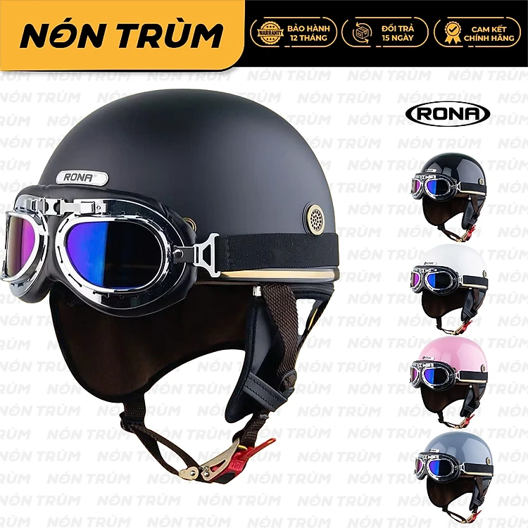 Mũ bảo hiểm xe máy 1/2 Rona Pug kèm kính phi công viền bạc cao cấp, nón có ốp tai che nắng có thể tháo rời