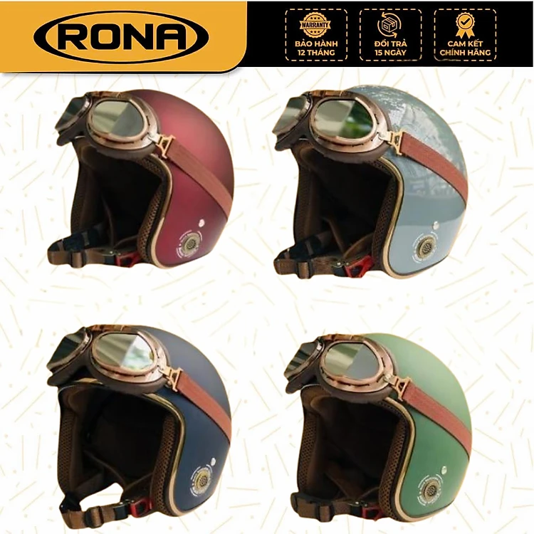 Mũ bảo hiểm xe máy 3/4 RONA R8 kèm kính phi công viền đồng cao cấp chính hãng
