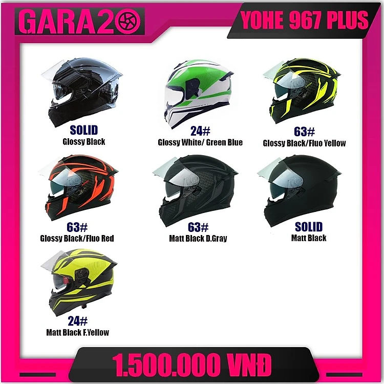 Mũ bảo hiểm Yohe 967 PLUS được đánh giá cao và được yêu thích bởi các mẫu tem mới theo hệ thống màu fluo phiên bản 2018. Mũ đạt chuẩn DOT với thiết kế form nón góc cạnh cùng hệ thống 2 kính tiện dụng. Phần đệm lót cực kì thoải mái và mềm mại, dễ chịu, thích hợp cho cả người dùng lần đầu làm quen với dòng mũ fullface.