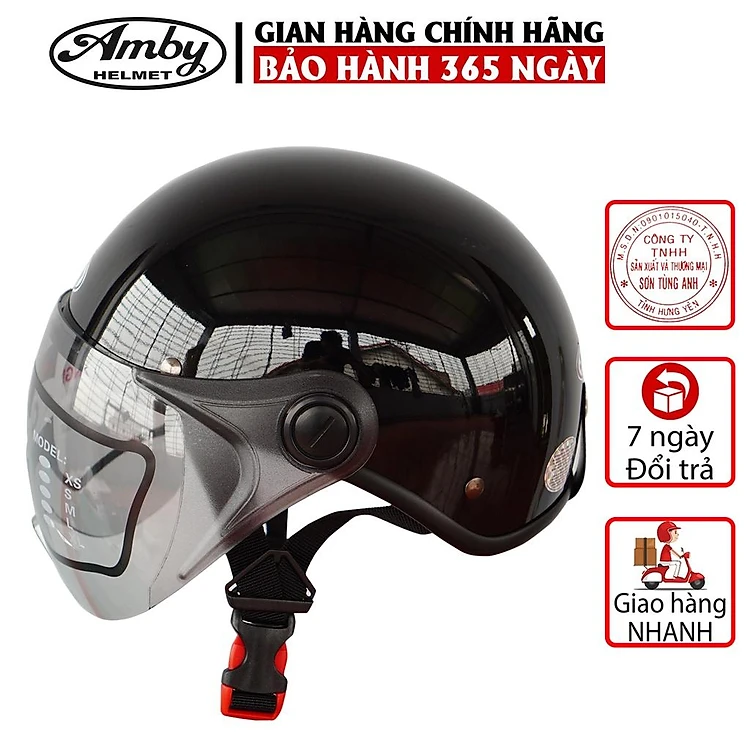 Mũ Bảo Hiểm Nửa Đầu Amby ST05, có kính che nửa mặt, kiểu dáng thời trang, khóa kim loại chắc chắn - Đen Bóng