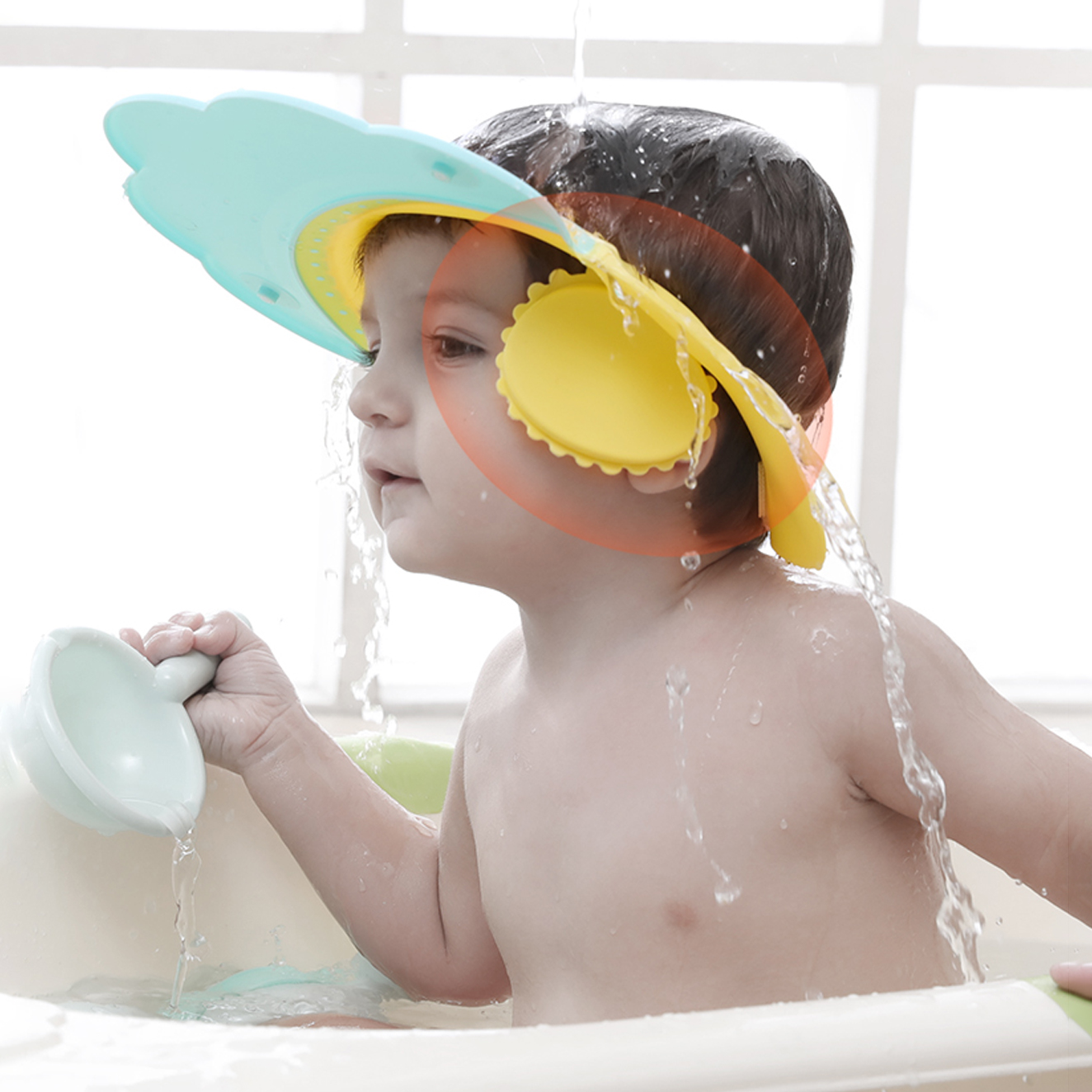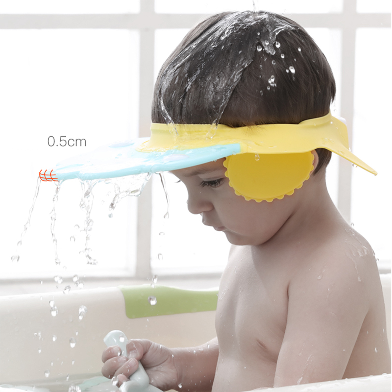 Chỉ cần điều chỉnh cho vừa với vòng đầu của bé rồi đặt nón lên trên đầu bé, thế là bạn đã có thể tắm gội thoải mái cho bé mà không phải lo ngại xà phòng hay nước ảnh hưởng đến mắt bé.