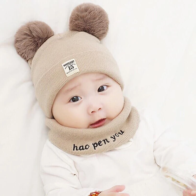 Mũ len 2 quả bông kèm khăn cho bé - màu ngẫu nhiên