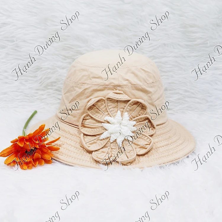 Mũ rộng vành nữ gắn hoa 9 cánh dễ thương, vành rộng 7cm, chất liệu vải cotton oát cao cấp oát mềm mại - Hạnh Dương