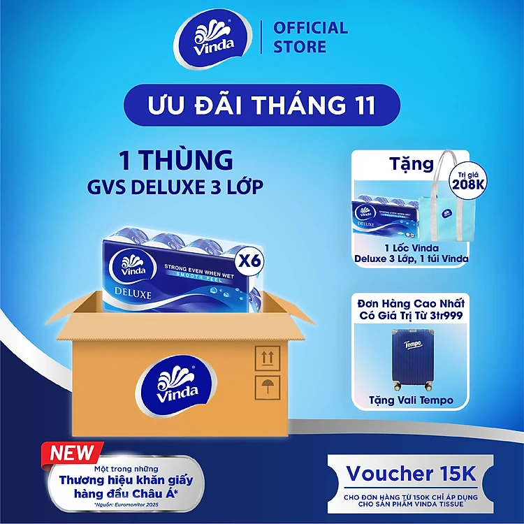 [MUA 1 THÙNG GVS DELUXE TẶNG 1 LỐC GVS DELUXE + 1 TÚI VINDA] Giấy vệ sinh cao cấp Vinda Deluxe 3 lớp (8 Cuộn)