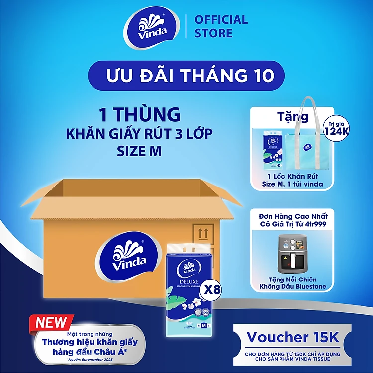 [MUA 1 THÙNG KHĂN RÚT SIZE M TẶNG 1 LỐC SIZE M + 1 TÚI VINDA] Khăn giấy rút cao cấp Vinda Deluxe 3 lớp 90 tờ size M (5 Gói)